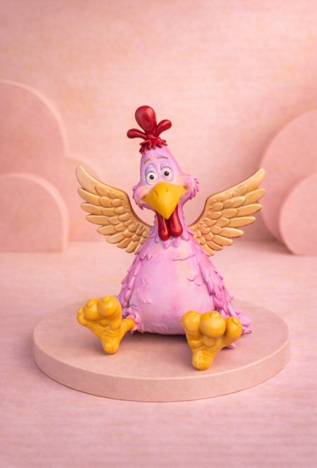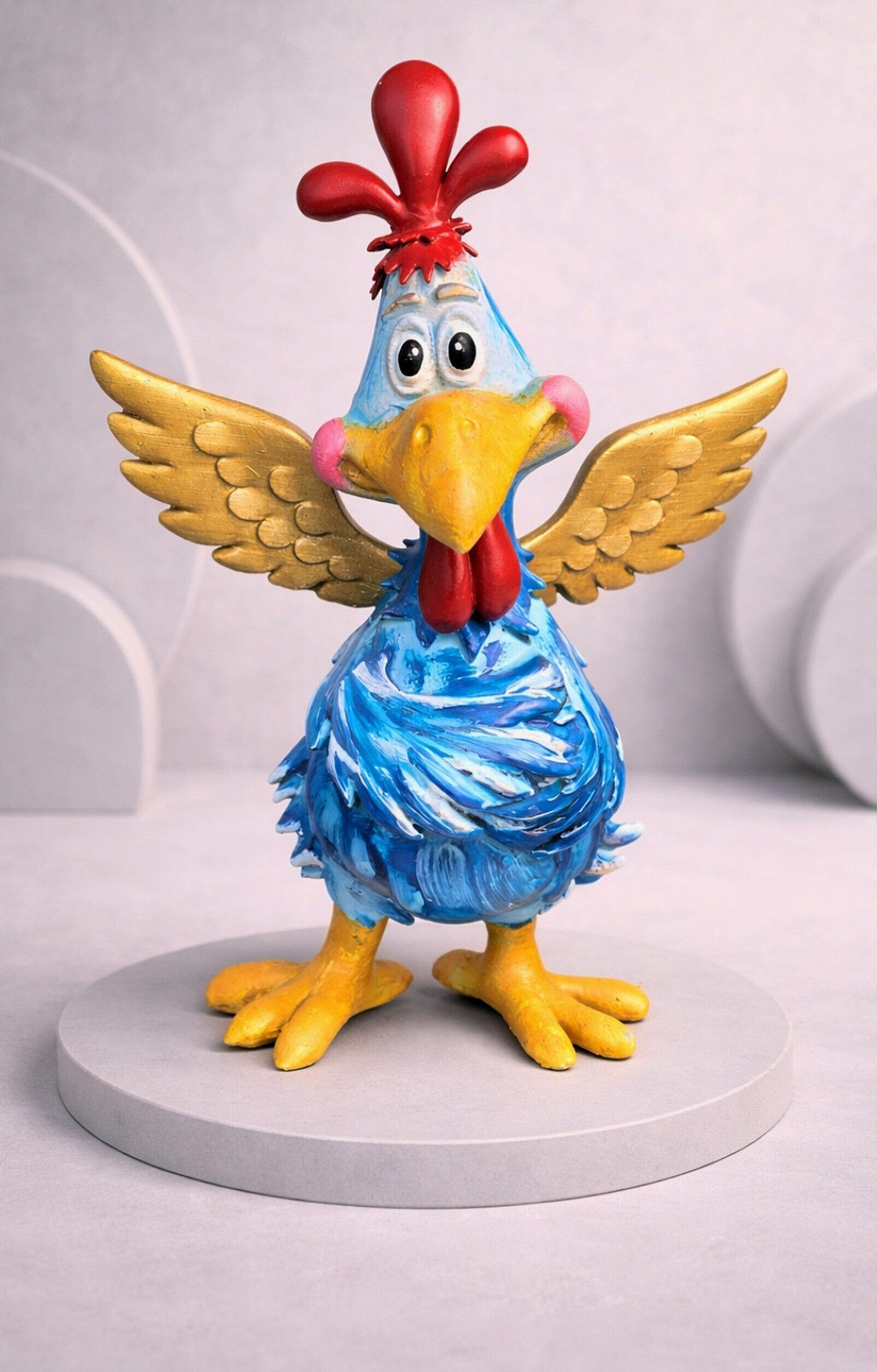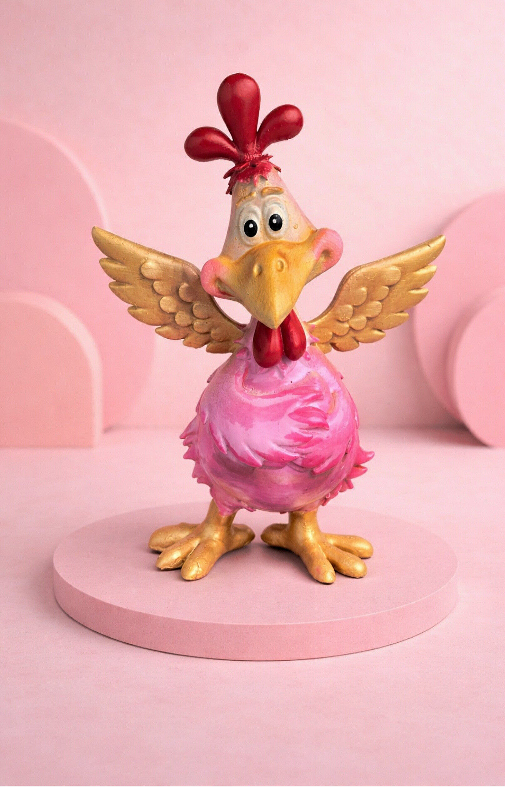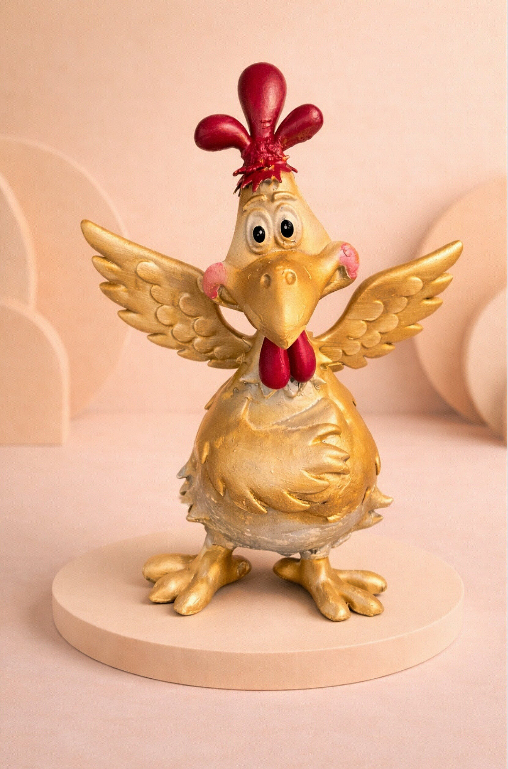 Dieses goldene Wunderhuhn (ca. 26 cm pure Hühner-Magie) ist immer zur Stelle, wenn es brenzlig wird. Mit Flügeln, die so golden glänzen, dass jedes Problem einfach geblendet abhaut. Es schaut vielleicht etwas verwirrt drein, aber hey: Es hat ein rotes Käppchen auf! Das bedeutet, es ist im Dienst.