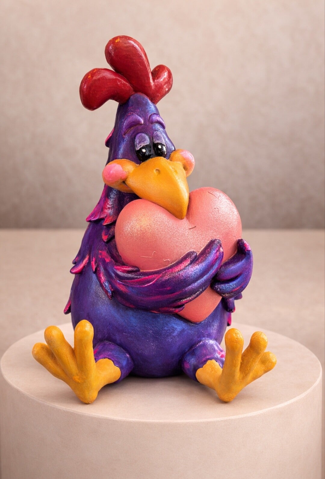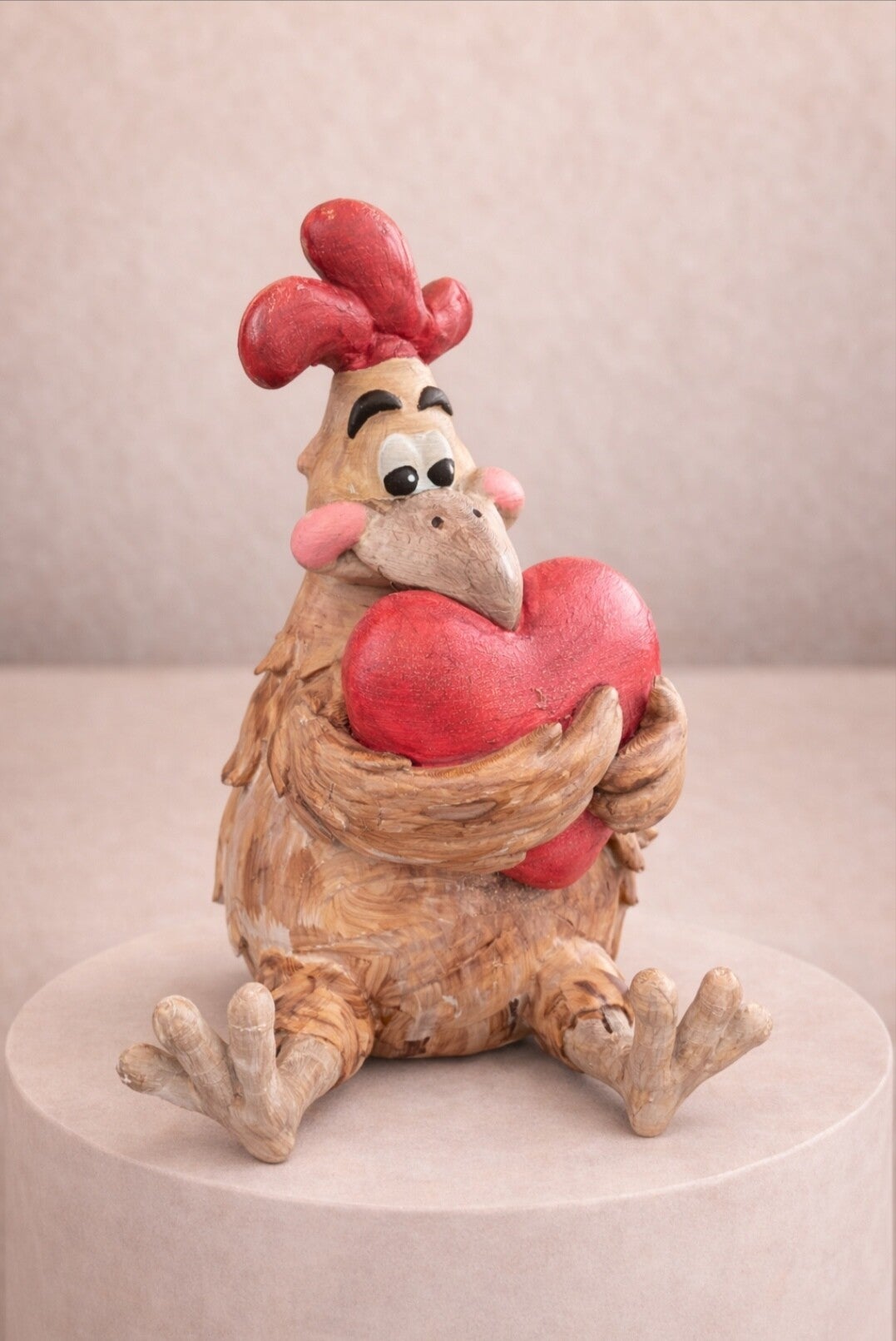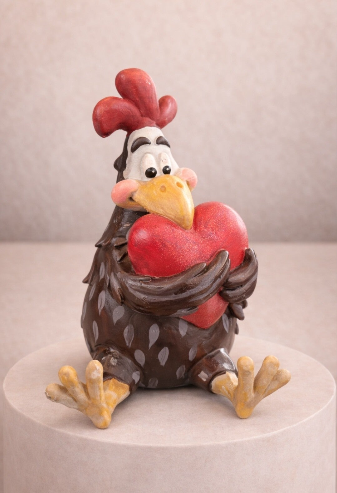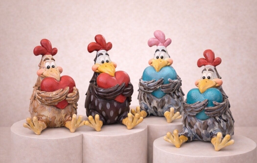 Vorsicht, hier kommt der ultimative Herzensbrecher! Dieses Huhn drückt sein Herz so fest an sich, als wäre es die letzte Portion Maiskörner auf Erden. Wer kann bei diesen treuen Augen und den dezenten roten Apfelbäckchen schon Nein sagen?